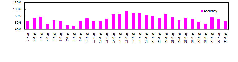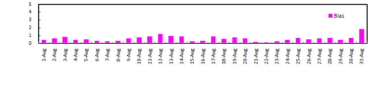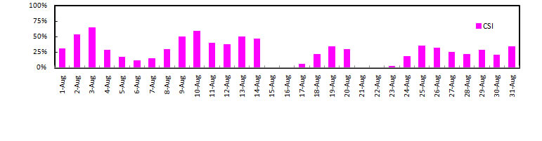 24-hr Avg. PM2.5 of August, 2010 , Threshold = 15 ug m-3 (Exceedance = 35 ug m-3)