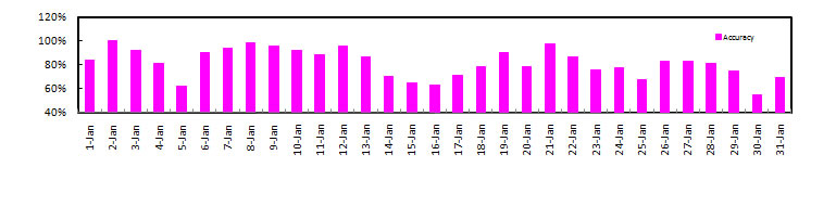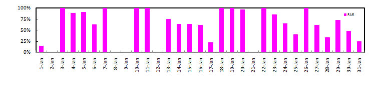 24-hr Avg. PM2.5 of January, 2011 , Threshold = 15 ug m-3 (Exceedance = 35 ug m-3)