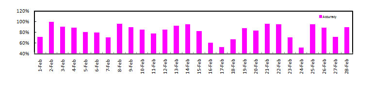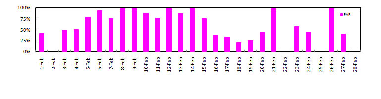 24-hr Avg. PM2.5 of February, 2011 , Threshold = 15 ug m-3 (Exceedance = 35 ug m-3)