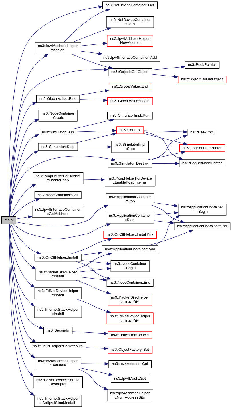 References ns3::Ipv4AddressHelper::Assign(), ns3::GlobalValue::Bind(), ns3::NodeContainer::Create(), ns3::Simulator::Destroy(), ns3::PcapHelperForDevice::EnablePcap(), ns3::NetDeviceContainer::Get(), ns3::NodeContainer::Get(), ns3::Ipv4InterfaceContainer::GetAddress(), ns3::Object::GetObject(), ns3::PacketSinkHelper::Install(), ns3::FdNetDeviceHelper::Install(), ns3::OnOffHelper::Install(), ns3::InternetStackHelper::Install(), NS_FATAL_ERROR, NS_LOG_INFO, ns3::Simulator::Run(), ns3::Seconds(), ns3::OnOffHelper::SetAttribute(), ns3::Ipv4AddressHelper::SetBase(), ns3::FdNetDevice::SetFileDescriptor(), ns3::InternetStackHelper::SetIpv4StackInstall(), ns3::ApplicationContainer::Start(), ns3::Simulator::Stop(), and ns3::ApplicationContainer::Stop().