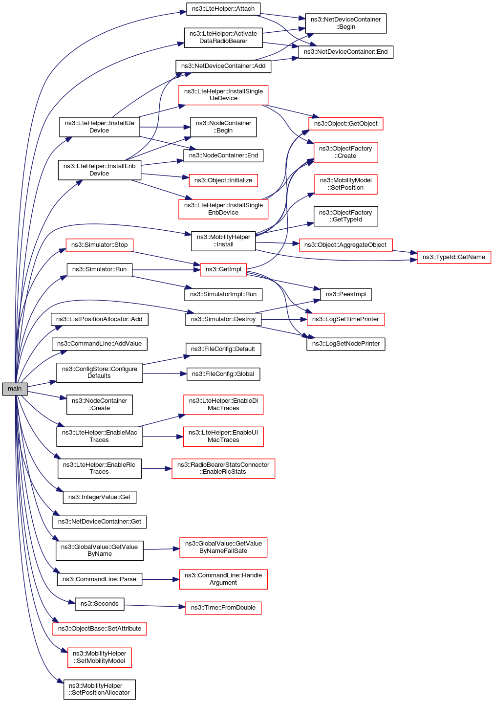 References ns3::LteHelper::ActivateDataRadioBearer(), ns3::ListPositionAllocator::Add(), ns3::CommandLine::AddValue(), ns3::LteHelper::Attach(), ns3::ConfigStore::ConfigureDefaults(), ns3::NodeContainer::Create(), ns3::Simulator::Destroy(), ns3::LteHelper::EnableMacTraces(), ns3::LteHelper::EnableRlcTraces(), ns3::EpsBearer::GBR_CONV_VOICE, ns3::IntegerValue::Get(), ns3::NetDeviceContainer::Get(), ns3::GlobalValue::GetValueByName(), ns3::MobilityHelper::Install(), ns3::LteHelper::InstallEnbDevice(), ns3::LteHelper::InstallUeDevice(), ns3::CommandLine::Parse(), ns3::Simulator::Run(), ns3::Seconds(), ns3::ObjectBase::SetAttribute(), ns3::MobilityHelper::SetMobilityModel(), ns3::MobilityHelper::SetPositionAllocator(), and ns3::Simulator::Stop().