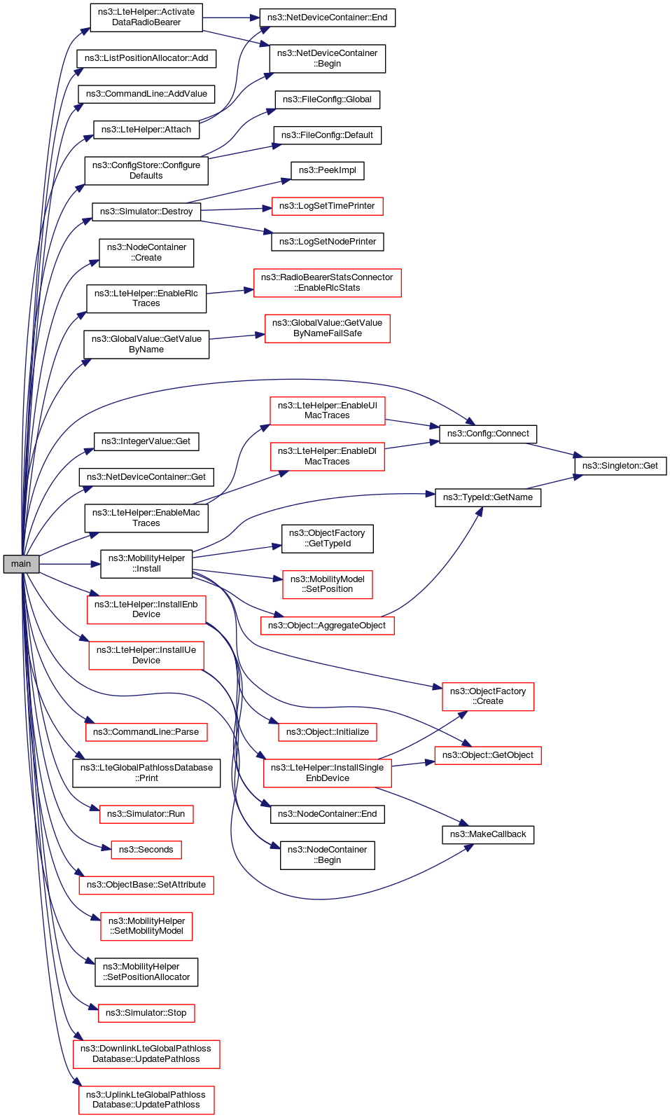 References ns3::LteHelper::ActivateDataRadioBearer(), ns3::ListPositionAllocator::Add(), ns3::CommandLine::AddValue(), ns3::LteHelper::Attach(), ns3::ConfigStore::ConfigureDefaults(), ns3::Config::Connect(), ns3::NodeContainer::Create(), ns3::Simulator::Destroy(), ns3::LteHelper::EnableMacTraces(), ns3::LteHelper::EnableRlcTraces(), ns3::EpsBearer::GBR_CONV_VOICE, ns3::IntegerValue::Get(), ns3::NetDeviceContainer::Get(), ns3::GlobalValue::GetValueByName(), ns3::MobilityHelper::Install(), ns3::LteHelper::InstallEnbDevice(), ns3::LteHelper::InstallUeDevice(), ns3::MakeCallback(), ns3::CommandLine::Parse(), ns3::LteGlobalPathlossDatabase::Print(), ns3::Simulator::Run(), ns3::Seconds(), ns3::ObjectBase::SetAttribute(), ns3::MobilityHelper::SetMobilityModel(), ns3::MobilityHelper::SetPositionAllocator(), ns3::Simulator::Stop(), ns3::DownlinkLteGlobalPathlossDatabase::UpdatePathloss(), and ns3::UplinkLteGlobalPathlossDatabase::UpdatePathloss().