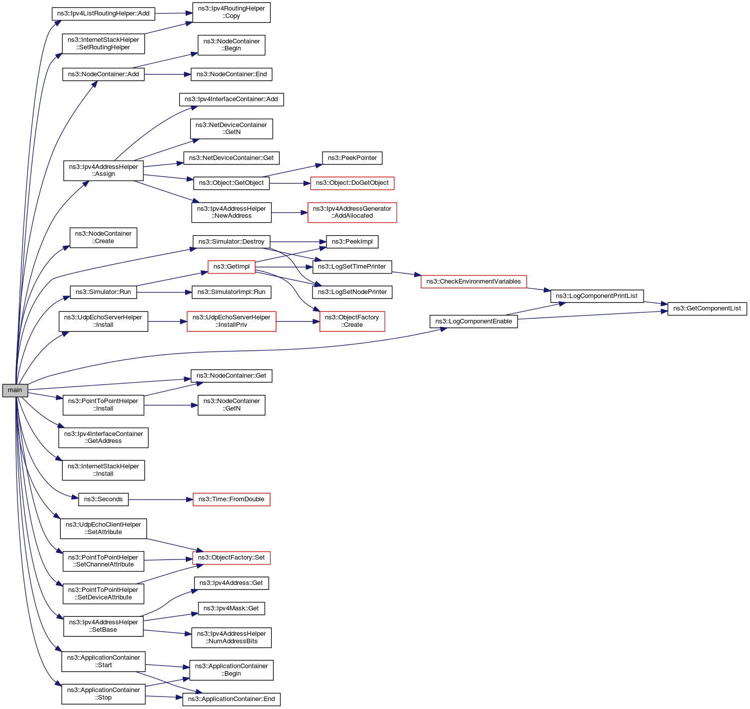 References ns3::Ipv4ListRoutingHelper::Add(), ns3::NodeContainer::Add(), ns3::Ipv4AddressHelper::Assign(), ns3::NodeContainer::Create(), ns3::Simulator::Destroy(), ns3::NodeContainer::Get(), ns3::Ipv4InterfaceContainer::GetAddress(), ns3::UdpEchoServerHelper::Install(), ns3::PointToPointHelper::Install(), ns3::InternetStackHelper::Install(), list, ns3::LOG_LEVEL_INFO, ns3::LogComponentEnable(), ns3::Simulator::Run(), ns3::Seconds(), ns3::UdpEchoClientHelper::SetAttribute(), ns3::Ipv4AddressHelper::SetBase(), ns3::PointToPointHelper::SetChannelAttribute(), ns3::PointToPointHelper::SetDeviceAttribute(), ns3::InternetStackHelper::SetRoutingHelper(), ns3::ApplicationContainer::Start(), and ns3::ApplicationContainer::Stop().