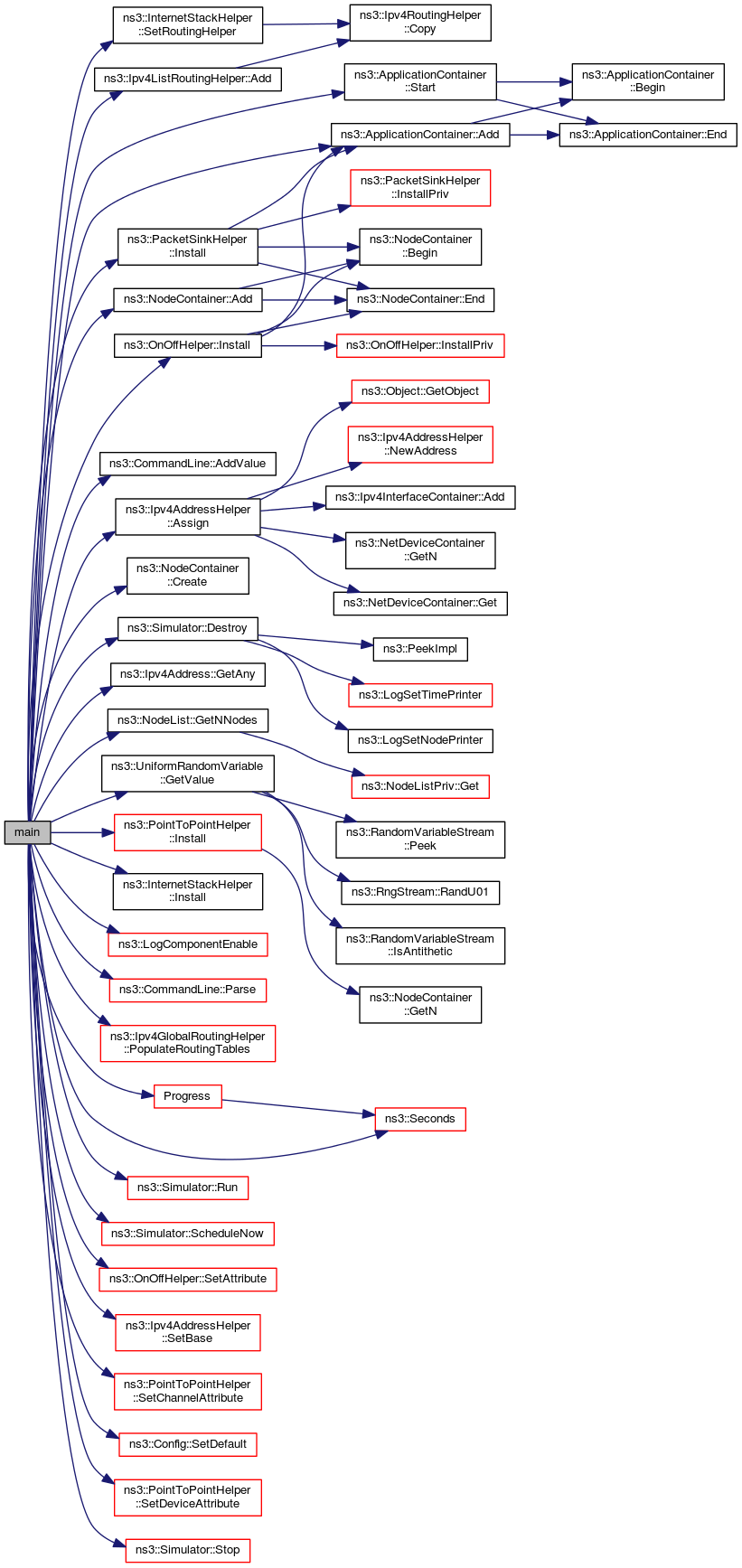 References ns3::Ipv4ListRoutingHelper::Add(), ns3::ApplicationContainer::Add(), ns3::NodeContainer::Add(), ns3::CommandLine::AddValue(), ns3::Ipv4AddressHelper::Assign(), ns3::NodeContainer::Create(), ns3::Simulator::Destroy(), ns3::Ipv4Address::GetAny(), ns3::NodeList::GetNNodes(), ns3::UniformRandomVariable::GetValue(), ns3::PacketSinkHelper::Install(), ns3::OnOffHelper::Install(), ns3::PointToPointHelper::Install(), ns3::InternetStackHelper::Install(), list, ns3::LOG_LEVEL_INFO, ns3::LogComponentEnable(), ns3::CommandLine::Parse(), ns3::Ipv4GlobalRoutingHelper::PopulateRoutingTables(), Progress(), ns3::Simulator::Run(), ns3::Simulator::ScheduleNow(), ns3::Seconds(), ns3::OnOffHelper::SetAttribute(), ns3::Ipv4AddressHelper::SetBase(), ns3::PointToPointHelper::SetChannelAttribute(), ns3::Config::SetDefault(), ns3::PointToPointHelper::SetDeviceAttribute(), ns3::InternetStackHelper::SetRoutingHelper(), ns3::ApplicationContainer::Start(), ns3::Simulator::Stop(), TIMER_DIFF, TIMER_NOW, and sample-rng-plot::x.