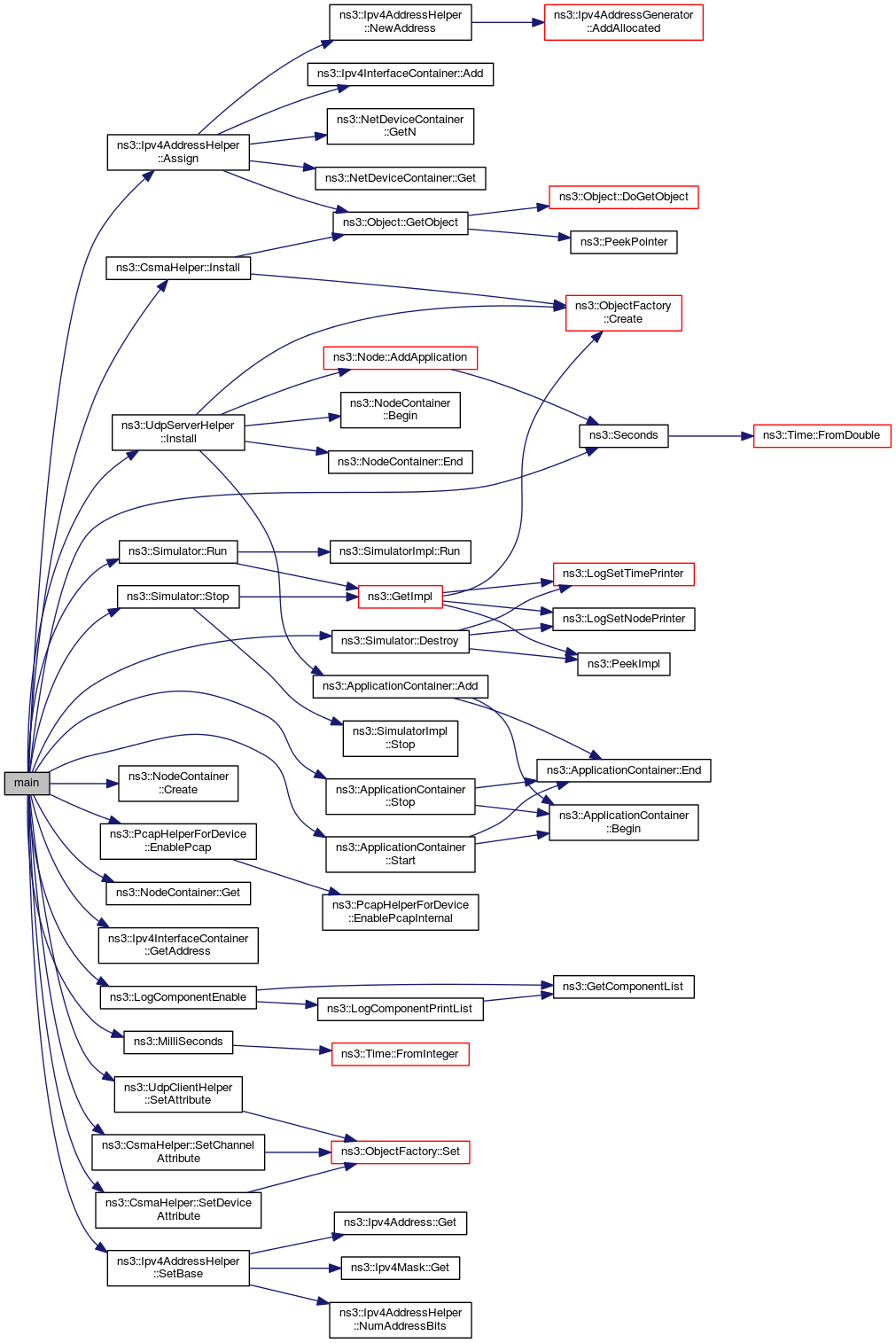 References ns3::Ipv4AddressHelper::Assign(), ns3::NodeContainer::Create(), ns3::Simulator::Destroy(), ns3::PcapHelperForDevice::EnablePcap(), ns3::NodeContainer::Get(), ns3::Ipv4InterfaceContainer::GetAddress(), ns3::UdpServerHelper::Install(), ns3::CsmaHelper::Install(), ns3::LOG_LEVEL_INFO, ns3::LogComponentEnable(), ns3::MilliSeconds(), NS_FATAL_ERROR, NS_LOG_INFO, port, ns3::Simulator::Run(), ns3::Seconds(), ns3::UdpClientHelper::SetAttribute(), ns3::Ipv4AddressHelper::SetBase(), ns3::CsmaHelper::SetChannelAttribute(), ns3::CsmaHelper::SetDeviceAttribute(), ns3::ApplicationContainer::Start(), ns3::Simulator::Stop(), and ns3::ApplicationContainer::Stop().