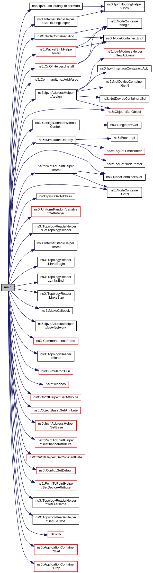 References ns3::Ipv4ListRoutingHelper::Add(), ns3::NodeContainer::Add(), ns3::CommandLine::AddValue(), ns3::Ipv4AddressHelper::Assign(), ns3::Config::ConnectWithoutContext(), ns3::Simulator::Destroy(), ns3::NodeContainer::Get(), ns3::Ipv4::GetAddress(), ns3::UniformRandomVariable::GetInteger(), ns3::NodeContainer::GetN(), ns3::Object::GetObject(), ns3::TopologyReaderHelper::GetTopologyReader(), ns3::PacketSinkHelper::Install(), ns3::OnOffHelper::Install(), ns3::PointToPointHelper::Install(), ns3::InternetStackHelper::Install(), ns3::TopologyReader::LinksBegin(), ns3::TopologyReader::LinksEnd(), ns3::TopologyReader::LinksSize(), ns3::MakeCallback(), ns3::Ipv4AddressHelper::NewNetwork(), NS_LOG_ERROR, NS_LOG_INFO, ns3::CommandLine::Parse(), ns3::TopologyReader::Read(), ns3::Simulator::Run(), ns3::Seconds(), ns3::OnOffHelper::SetAttribute(), ns3::ObjectBase::SetAttribute(), ns3::Ipv4AddressHelper::SetBase(), ns3::PointToPointHelper::SetChannelAttribute(), ns3::OnOffHelper::SetConstantRate(), ns3::Config::SetDefault(), ns3::PointToPointHelper::SetDeviceAttribute(), ns3::TopologyReaderHelper::SetFileName(), ns3::TopologyReaderHelper::SetFileType(), ns3::InternetStackHelper::SetRoutingHelper(), SinkRx(), ns3::ApplicationContainer::Start(), and ns3::ApplicationContainer::Stop().