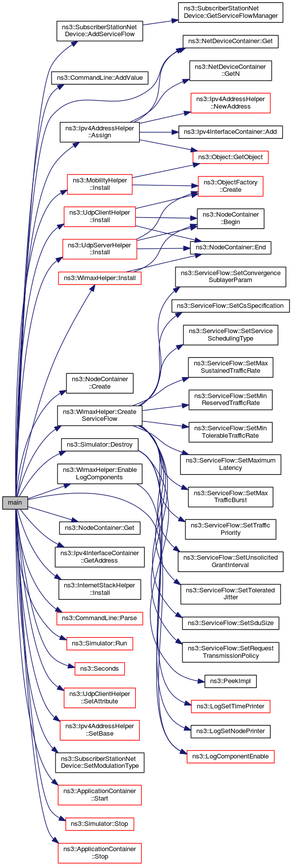 References ns3::SubscriberStationNetDevice::AddServiceFlow(), ns3::CommandLine::AddValue(), ns3::Ipv4AddressHelper::Assign(), ns3::NodeContainer::Create(), ns3::WimaxHelper::CreateServiceFlow(), ns3::Simulator::Destroy(), ns3::WimaxHelper::DEVICE_TYPE_BASE_STATION, ns3::WimaxHelper::DEVICE_TYPE_SUBSCRIBER_STATION, ns3::WimaxHelper::EnableLogComponents(), ns3::NetDeviceContainer::Get(), ns3::NodeContainer::Get(), ns3::Ipv4InterfaceContainer::GetAddress(), ns3::UdpServerHelper::Install(), ns3::InternetStackHelper::Install(), ns3::UdpClientHelper::Install(), ns3::WimaxHelper::Install(), ns3::MobilityHelper::Install(), ns3::LOG_LEVEL_INFO, ns3::LogComponentEnable(), ns3::WimaxPhy::MODULATION_TYPE_QAM16_12, NS_LOG_INFO, ns3::CommandLine::Parse(), ns3::Simulator::Run(), ns3::WimaxHelper::SCHED_TYPE_MBQOS, ns3::WimaxHelper::SCHED_TYPE_RTPS, ns3::WimaxHelper::SCHED_TYPE_SIMPLE, ns3::Seconds(), ns3::UdpClientHelper::SetAttribute(), ns3::Ipv4AddressHelper::SetBase(), ns3::SubscriberStationNetDevice::SetModulationType(), ns3::ServiceFlow::SF_DIRECTION_DOWN, ns3::ServiceFlow::SF_DIRECTION_UP, ns3::ServiceFlow::SF_TYPE_BE, ns3::WimaxHelper::SIMPLE_PHY_TYPE_OFDM, ns3::ApplicationContainer::Start(), ns3::Simulator::Stop(), ns3::ApplicationContainer::Stop(), and verbose.