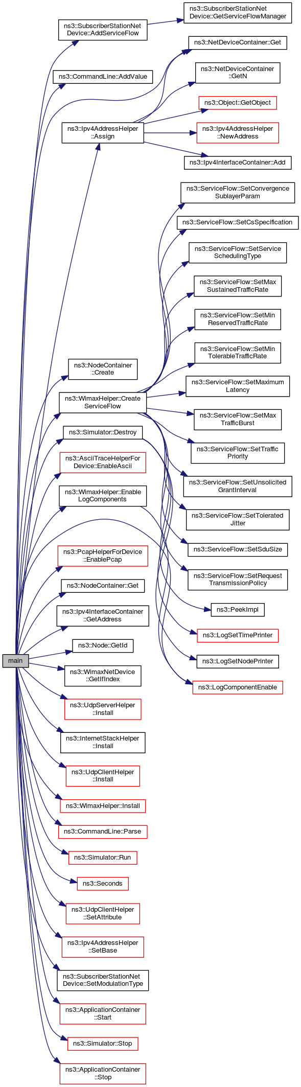 References ns3::SubscriberStationNetDevice::AddServiceFlow(), ns3::CommandLine::AddValue(), ns3::Ipv4AddressHelper::Assign(), ns3::NodeContainer::Create(), ns3::WimaxHelper::CreateServiceFlow(), ns3::Simulator::Destroy(), ns3::WimaxHelper::DEVICE_TYPE_BASE_STATION, ns3::WimaxHelper::DEVICE_TYPE_SUBSCRIBER_STATION, ns3::AsciiTraceHelperForDevice::EnableAscii(), ns3::WimaxHelper::EnableLogComponents(), ns3::PcapHelperForDevice::EnablePcap(), ns3::NetDeviceContainer::Get(), ns3::NodeContainer::Get(), ns3::Ipv4InterfaceContainer::GetAddress(), ns3::Node::GetId(), ns3::WimaxNetDevice::GetIfIndex(), ns3::UdpServerHelper::Install(), ns3::InternetStackHelper::Install(), ns3::UdpClientHelper::Install(), ns3::WimaxHelper::Install(), ns3::LOG_LEVEL_INFO, ns3::LogComponentEnable(), ns3::WimaxPhy::MODULATION_TYPE_QAM16_12, NS_LOG_INFO, ns3::CommandLine::Parse(), ns3::Simulator::Run(), ns3::WimaxHelper::SCHED_TYPE_MBQOS, ns3::WimaxHelper::SCHED_TYPE_RTPS, ns3::WimaxHelper::SCHED_TYPE_SIMPLE, ns3::Seconds(), ns3::UdpClientHelper::SetAttribute(), ns3::Ipv4AddressHelper::SetBase(), ns3::SubscriberStationNetDevice::SetModulationType(), ns3::ServiceFlow::SF_DIRECTION_DOWN, ns3::ServiceFlow::SF_DIRECTION_UP, ns3::ServiceFlow::SF_TYPE_RTPS, ns3::WimaxHelper::SIMPLE_PHY_TYPE_OFDM, ns3::ApplicationContainer::Start(), ns3::Simulator::Stop(), ns3::ApplicationContainer::Stop(), and verbose.