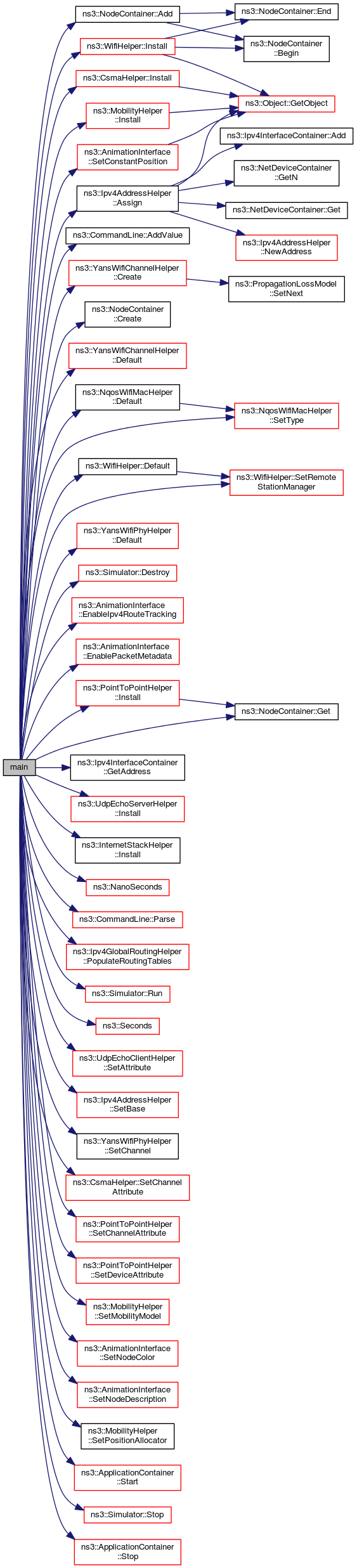 References ns3::NodeContainer::Add(), ns3::CommandLine::AddValue(), ns3::Ipv4AddressHelper::Assign(), ns3::YansWifiChannelHelper::Create(), ns3::NodeContainer::Create(), ns3::YansWifiChannelHelper::Default(), ns3::NqosWifiMacHelper::Default(), ns3::WifiHelper::Default(), ns3::YansWifiPhyHelper::Default(), ns3::Simulator::Destroy(), ns3::AnimationInterface::EnableIpv4RouteTracking(), ns3::AnimationInterface::EnablePacketMetadata(), ns3::NodeContainer::Get(), ns3::Ipv4InterfaceContainer::GetAddress(), ns3::UdpEchoServerHelper::Install(), ns3::CsmaHelper::Install(), ns3::PointToPointHelper::Install(), ns3::InternetStackHelper::Install(), ns3::WifiHelper::Install(), ns3::MobilityHelper::Install(), ns3::NanoSeconds(), ns3::CommandLine::Parse(), ns3::Ipv4GlobalRoutingHelper::PopulateRoutingTables(), ns3::Simulator::Run(), ns3::Seconds(), ns3::UdpEchoClientHelper::SetAttribute(), ns3::Ipv4AddressHelper::SetBase(), ns3::YansWifiPhyHelper::SetChannel(), ns3::CsmaHelper::SetChannelAttribute(), ns3::PointToPointHelper::SetChannelAttribute(), ns3::AnimationInterface::SetConstantPosition(), ns3::PointToPointHelper::SetDeviceAttribute(), ns3::MobilityHelper::SetMobilityModel(), ns3::AnimationInterface::SetNodeColor(), ns3::AnimationInterface::SetNodeDescription(), ns3::MobilityHelper::SetPositionAllocator(), ns3::WifiHelper::SetRemoteStationManager(), ns3::NqosWifiMacHelper::SetType(), ns3::ApplicationContainer::Start(), ns3::Simulator::Stop(), and ns3::ApplicationContainer::Stop().