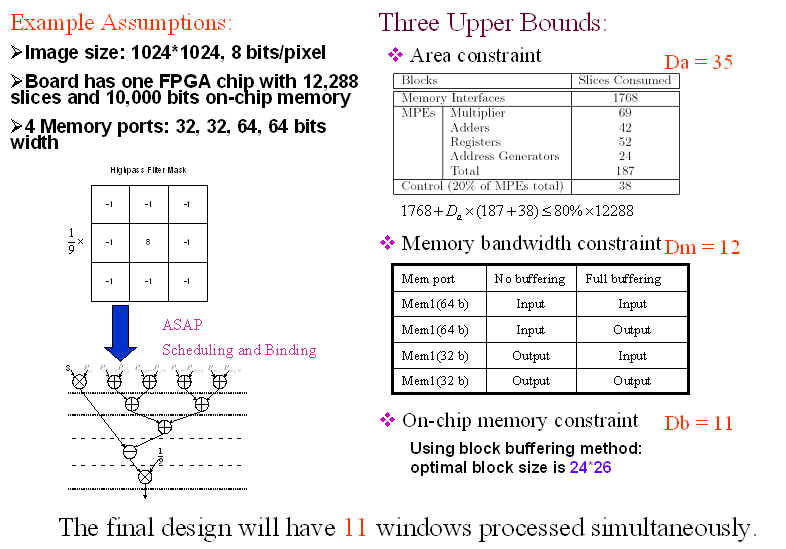 defining three upper bounds according to area constraints, memory bandwidth and on-chip memory size constraints, the maximal speedup is estimated and a corresponding hardware block structure is also determined at the same time.