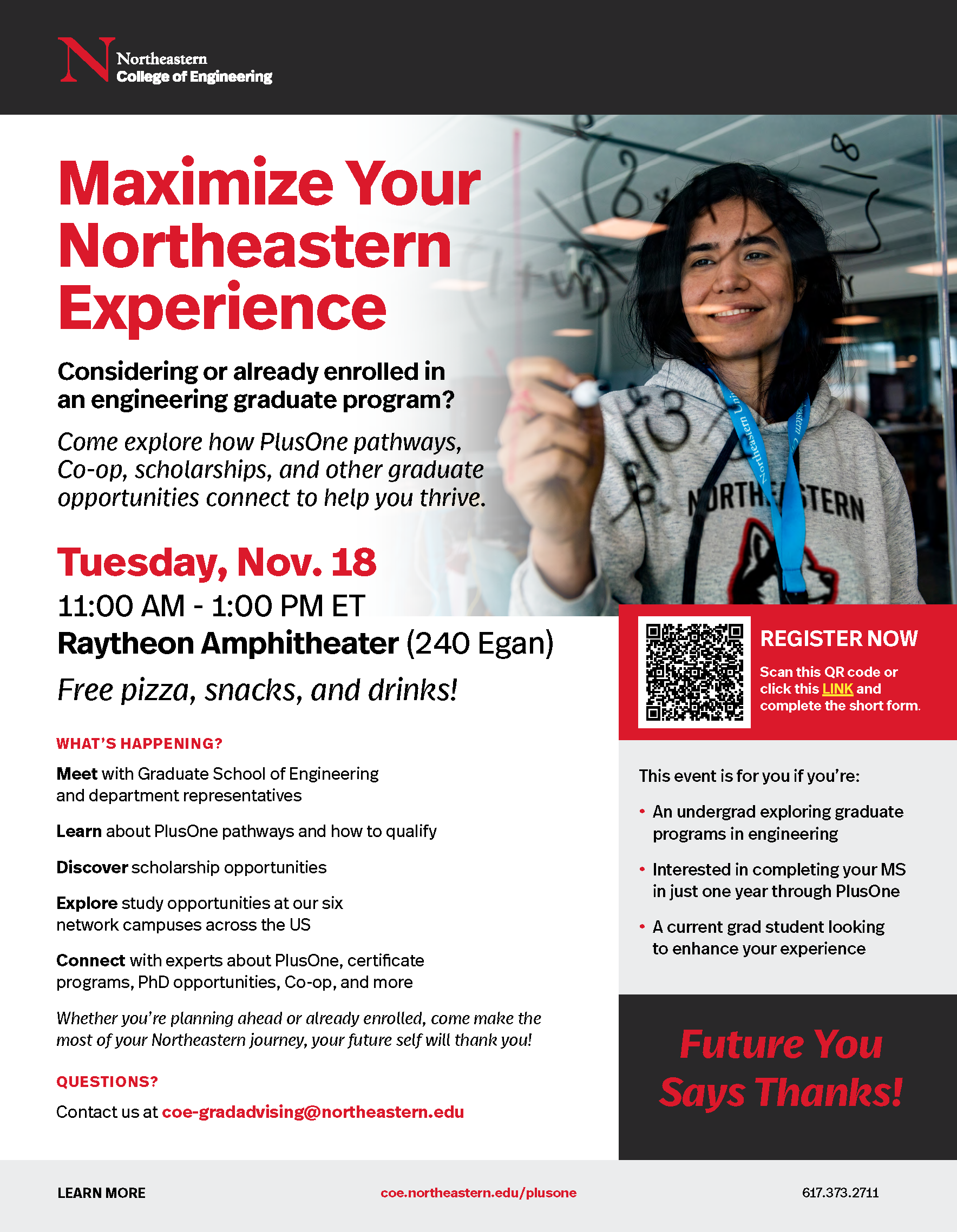 To learn about the graduate experience at Northeastern, visit the Graduate School of Engineering and connect with a student ambassador.