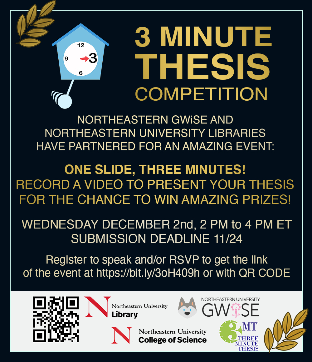 The annual GWiSE 3 Minute Thesis Competition 2020 is finally here! The 3MT is an academic competition that challenges Ph.D. students to describe their research within three minutes. This is a great opportunity to practice pitching your research to a non-specialist audience and to improve your science communication. Northeastern GWiSE and the Northeastern University Library have partnered to make 3 Minute Thesis possible with some pretty cool prizes: