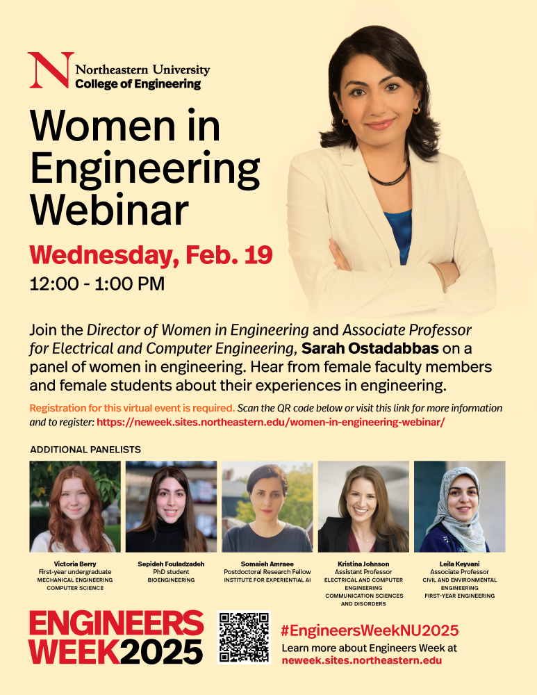 Join us for a one-hour virtual panel discussion during National Engineers Week, hosted by Sarah Ostadabbas, associate professor of electrical and computer engineering and director of the Women in Engineering program at Northeastern. Following last year’s successful focus on career challenges and helpful resources, this year’s panel will explore the personal and professional experiences of women in engineering more deeply.