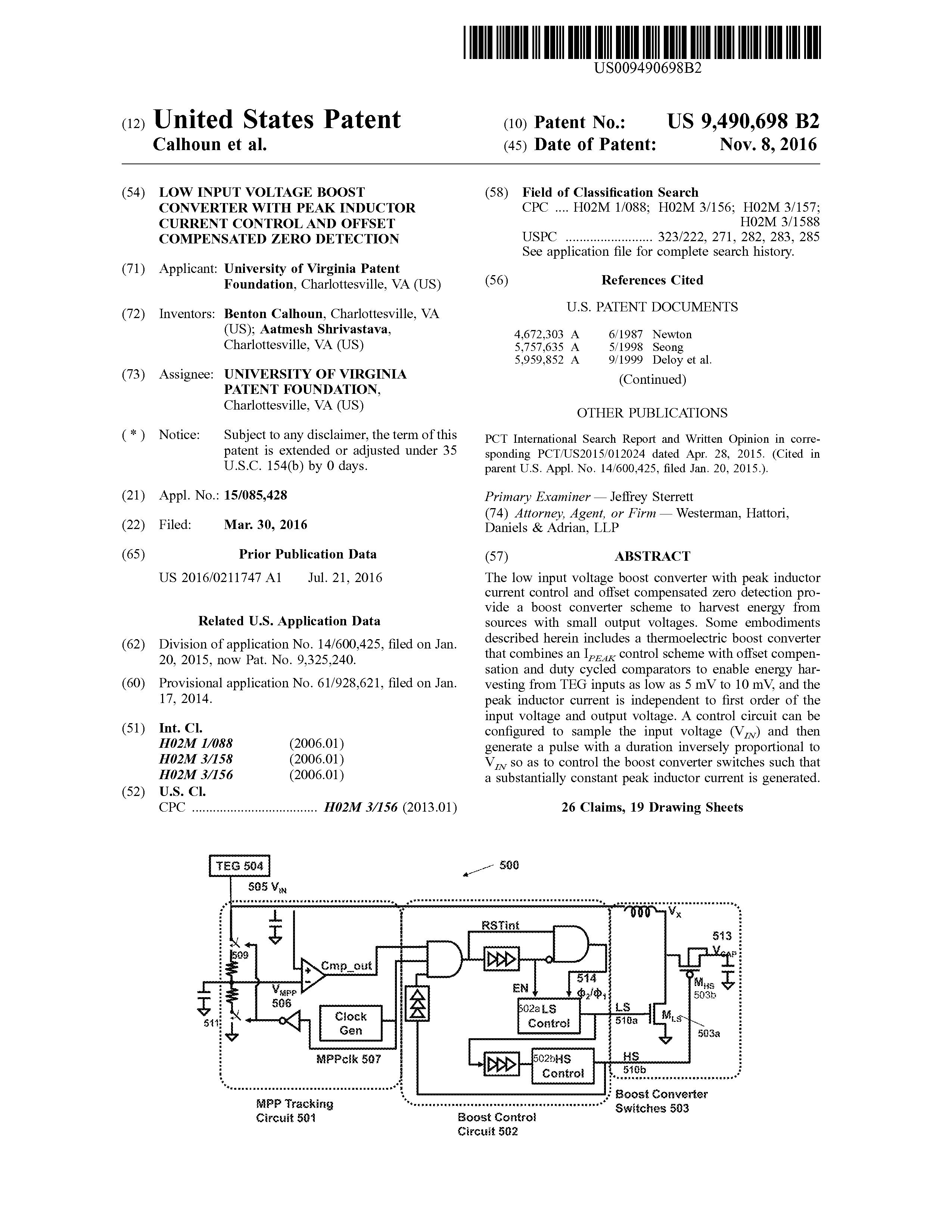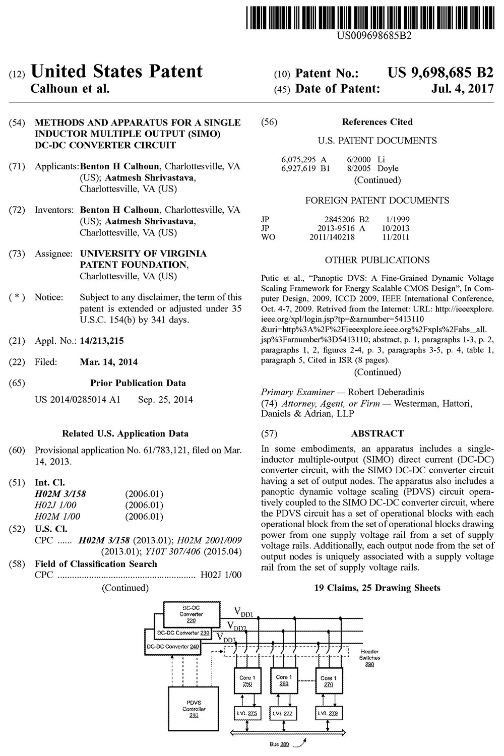 ECE Assistant Professor Aatmesh Shrivastava awarded a patent for “Low input voltage boost converter with peak inductor current control and offset compensated zero detection.”