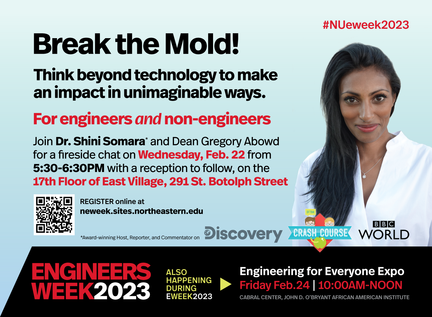 As part of our celebration of National Engineers Week, award-winning engineer and commentator Dr. Shini Somara and Dean Gregory Abowd will be hosting a Fireside Chat–Break the Mold! Think Beyond Technology To Make an Impact in Unimaginable Ways.