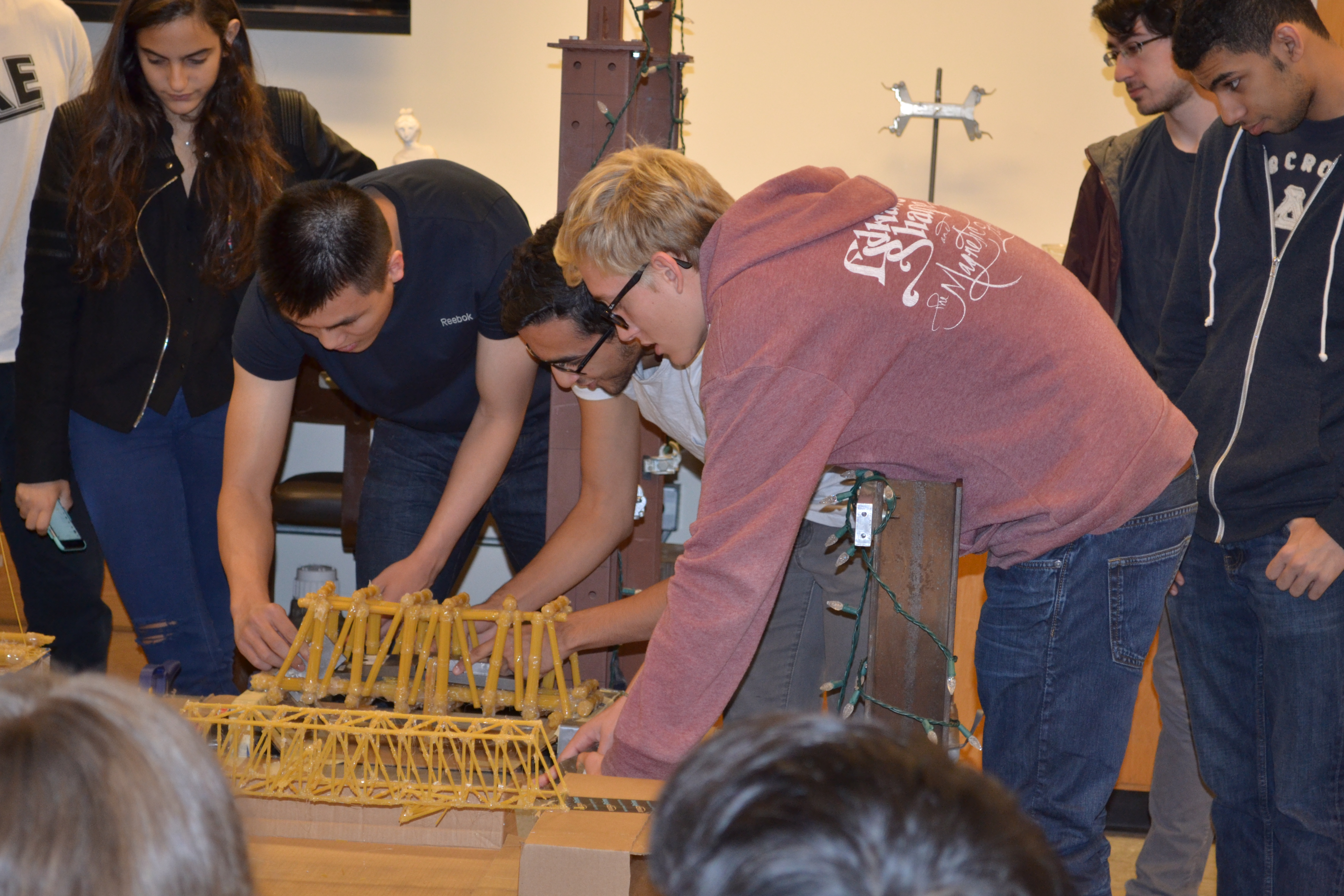 Freshman engineering students put their bridge designs to the test in the simulated earthquake shake lab.
