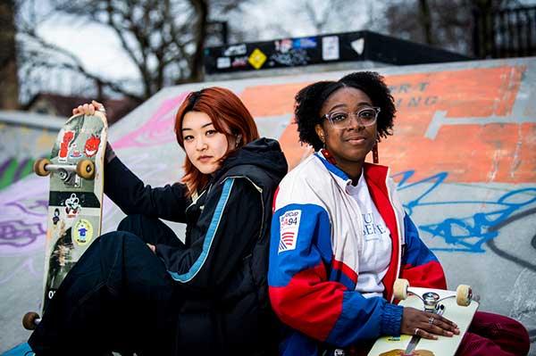 Main photo: Claire Lee, left, and Rayven Tate, right, founded the LonelyBones Skate Collective, a diverse group of skaters that comprises all levels of experience. Lee is a 2021 graduate of Northeastern with a degree in bioengineering and math and Tate is a 2021 graduate with a degree in mechanical engineering. Photo by Alyssa Stone/Northeastern University