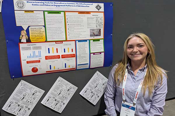 Chemical engineering student Kate Bevec, E’26, won third place in the Education and Other category at the AIChE National Student Conference for her poster on “Diverse Learning Tools for Neurodiverse Learners: The Effectiveness of Comics and Videos and Engagement Patterns in STEM Education.” Driven by her own idea, Bevec presented compelling research on the potential of educational comics as learning tools for neurodiverse STEM populations. By interviewing nearly 20 students across the country, she was able to show a significant increase in engagement and interest among neurodiverse learners.