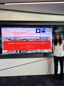 After completing her co-op at Insulet, Uddin went on to her second co-op as a materials science and aerospace engineering research assistant co-op for Roux NASA Aerospace Projects. Uddin had the opportunity to work on three different aerospace projects, which exposed her to the diversity of endeavors in the aerospace industry. Her first project was in collaboration with the University of Maine, working with rainbow diffraction to detect strain. Strain influences “rainbow” diffraction patterns by altering their internal structure and creating an effect known as photoelasticity. The resulting colorful patterns indicate the areas of greatest mechanical stress. Uddin was tasked with figuring out how to imprint a rainbow diffraction grating surface onto 3D printed objects. One attempt involved projecting a rainbow pattern onto a tensile dog bone. The research aimed to create a low-cost strain gauge as an easy way to do structural health monitoring of objects.