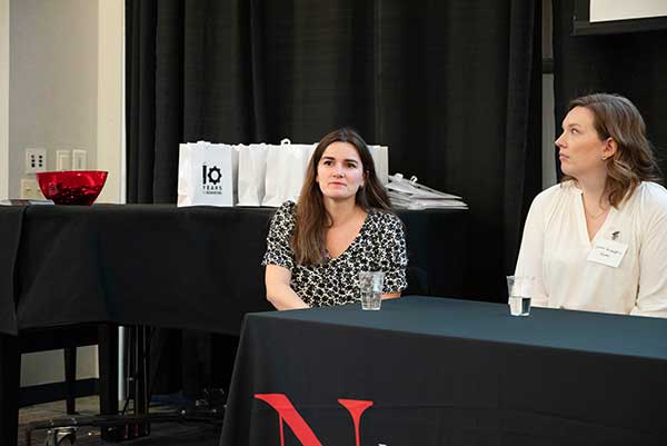 - Johnson listens to a current student’s question during the panel.