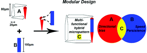 Basic micropattern shapes, such as stripes and teardrops, affect individual facets of cell motility, such as migration speed and directional bias, respectively. Here, we test the idea that these individual effects on cell motility can be brought together to achieve multidimensional improvements in cell behavior through the modular reconstruction of the simpler “building block” micropatterns. While a modular design strategy is conceptually appealing, current evidence suggests that combining environmental cues, especially molecular cues, such as growth factors and matrix proteins, elicits a highly nonlinear, synergistic cell response. Here, we show that, unlike molecular cues, combining stripe and teardrop geometric cues into a hybrid, spear-shaped micropattern yields combinatorial benefits in cell speed, persistence, and directional bias. Furthermore, cell migration speed and persistence are enhanced in a predictable, additive manner on the modular spear-shaped design. Meanwhile, the spear micropattern also improved the directional bias of cell movement compared to the standard teardrop geometry, revealing that combining geometric features can also lead to unexpected synergistic effects in certain aspects of cell motility. Our findings demonstrate that the modular design of hybrid micropatterns from simpler building block shapes achieves combinatorial improvements in cell motility. These findings have implications for engineering biomaterials that effectively mix and match micropatterns to modulate and direct cell motility in applications, such as tissue engineering and lab-on-a-chip devices.