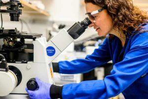 Rebecca Carrier, associate chair of research in the Department of Chemical Engineering, researches retinal and gut epithelial repair in the Interdisciplinary Science and Engineering Complex on Jan. 24, 2023. Photo by Matthew Modoono/Northeastern University