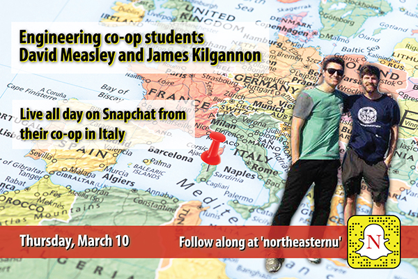 Join engineering co-op students David Measley and James Kilgannon on Snapchat today March 10 LIVE from their co-op in Italy! Log into Snapchat and follow along at ‘northeasternu’.