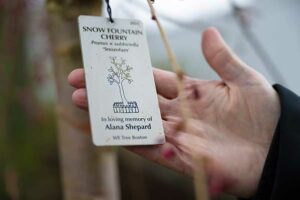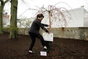 “During COVID, I was working a million hours,” she says of the isolated lifestyle created by the pandemic. “I was looking out the window and I realized, ‘Oh my gosh, it really does improve mental health’—you look at a tree, you hear the birds. It really helps.” Dovetailing with that revelation were Northeastern Global News stories, including one about the drought of 2022. As proud Northeastern graduates, it occurred to Cathy and Tom that something had to build the tree population in their urban neighborhood—and that they should be the ones to do it.