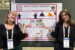Bayles and her lab partner, Marissa Darcangelo, earned first place for Education and Other category at the American Institute of Chemical Engineers (AIChE) National Student Conference 2025 for their research with COE Distinguished Teaching Professor and Associate Chair for Undergraduate Studies Luke Landherr. This research consisted of a series of comics and concept test questions depicting the content of the first-year chemical engineering class, to assess the importance of visual learning tools in the classroom. They divided the course content into 16 topics, creating 10-page comics for each that helps students learn while empowering them through diverse representation. This research is important to Bayles because she believes “…in order to create good engineers, we need to have a good engineering education which accommodates diverse learners and learning styles.”