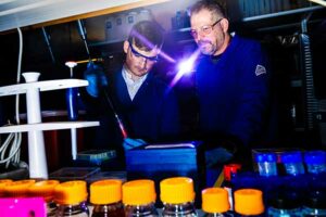 Northeastern professor of bioengineering Jeffrey Ruberti (right) and Jason Olszewski, a student research assistant, work in Ruberti’s ISEC lab on Thursday, Feb. 8, 2024. Photo by Alyssa Stone/Northeastern University