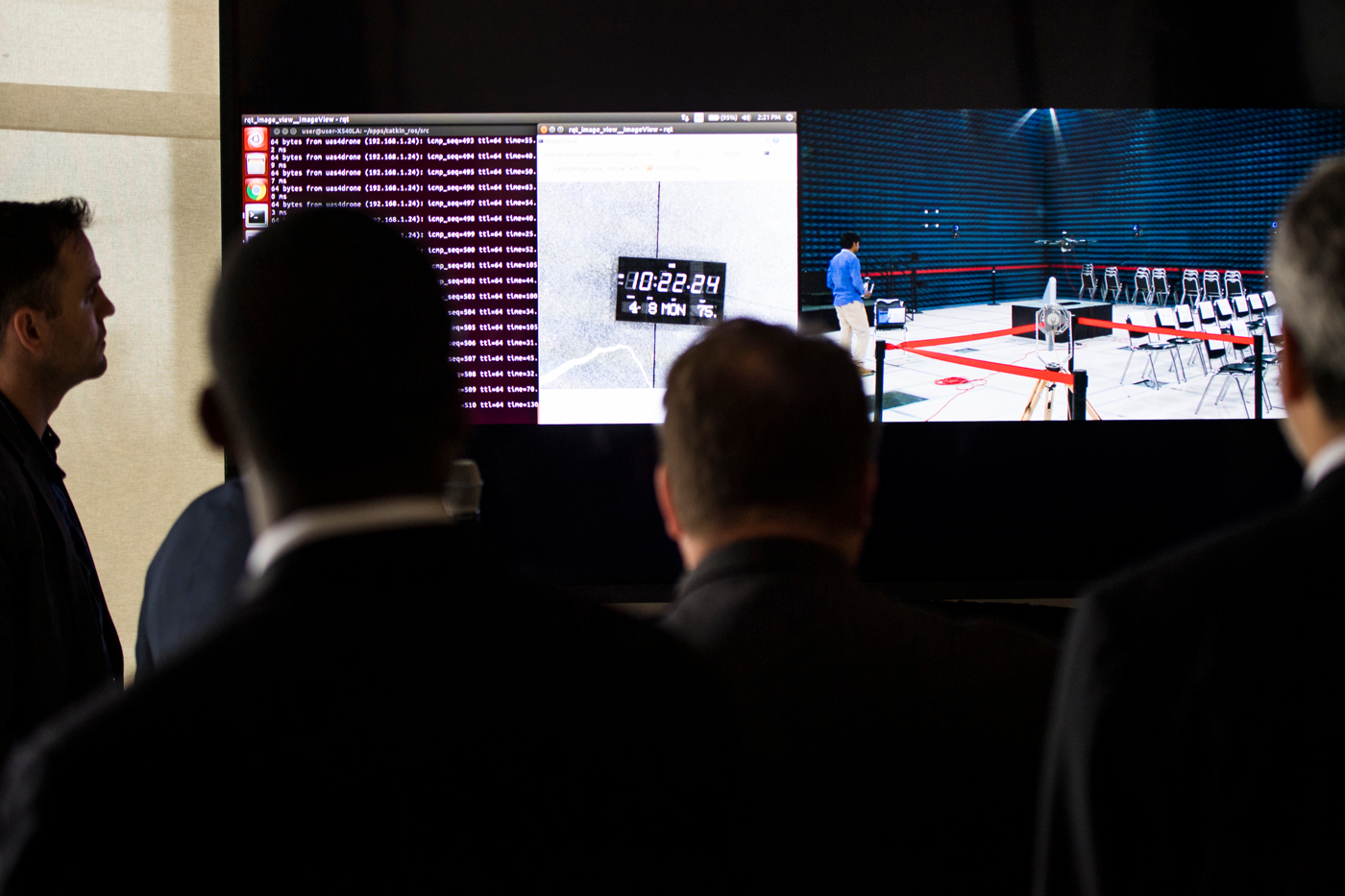 On Monday, the flooring was installed to enable the ceremony to be held within the facility, which is also encased with a Faraday cage of conducting material that creates an electromagnetic shield. Attendees watched a demonstration of a drone’s signals being jammed.