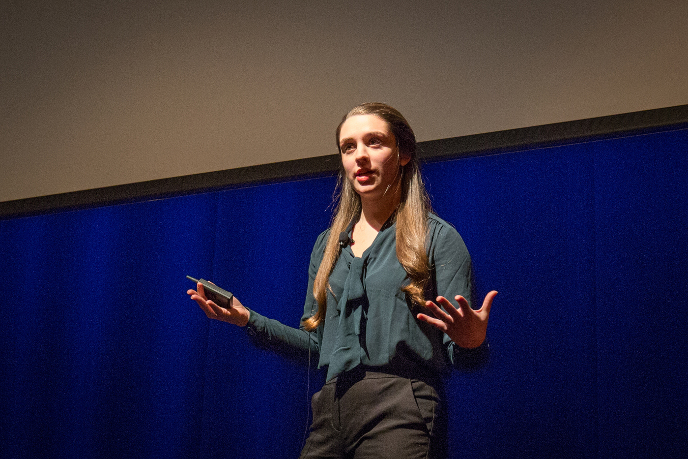Emma Kaeli, E’18, explains how quantum dot solar cells can improve solar energy efficiency at NU Talk 2017. Photo by Alastair Pike for Northeastern University