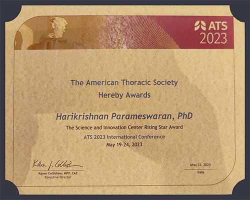 BioE Assistant Professor Harikrishnan Parameswaran was presented with a Rising Star Award for his research in the area of respiratory structure and function by the American Thoracic Society’s Science and Innovation Center (SIC). The award was presented at the American Thoracic Society 2023 International Conference held May 19-24, 2023, in Washington, DC. SIC is a collaboration of basic and translational scientists to network and learn more about emerging new technologies advancing research in respiratory, critical care and sleep medicine.