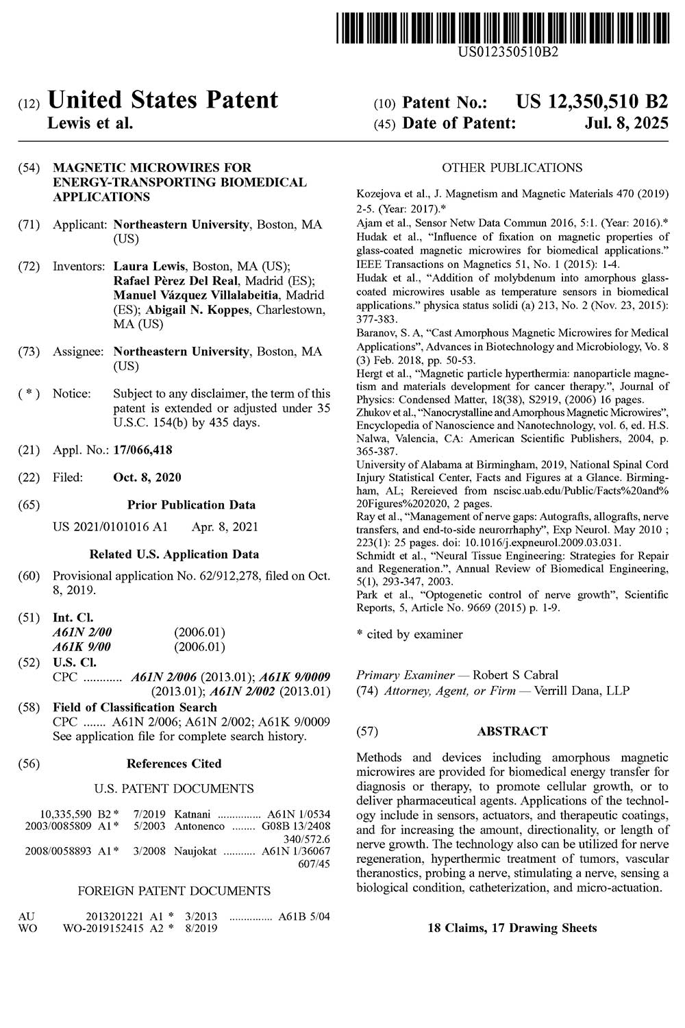 Distinguished University and Cabot Professor Laura Lewis, ChE/MIE, and ChE Associate Professor Abigail Koppes were awarded a patent for “Magnetic microwires for energy-transporting biomedical applications.”