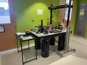 The next project Zhao worked on involved developing an optic system. The system included a laser directed at the devices, and the resulting mechanical vibrations generated heat, which was measured using a path-stabilized Michelson interferometer. Zhao contributed by producing detailed optical path designs in CAD and setting up multiple configurations of the system to optimize performance. By the end of his co-op, Zhao had the optics table set up for all the laser passes and completed calculations about the noise ratio needed for the laser.