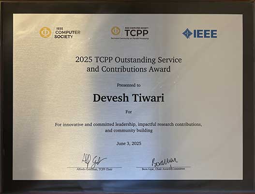 ECE Associate Professor Devesh Tiwari was awarded the 2025 IEEE Technical Community on Parallel Processing (TCPP) Outstanding Service and Contributions Award for “innovative and committed leadership, impactful research contributions, and community building.”