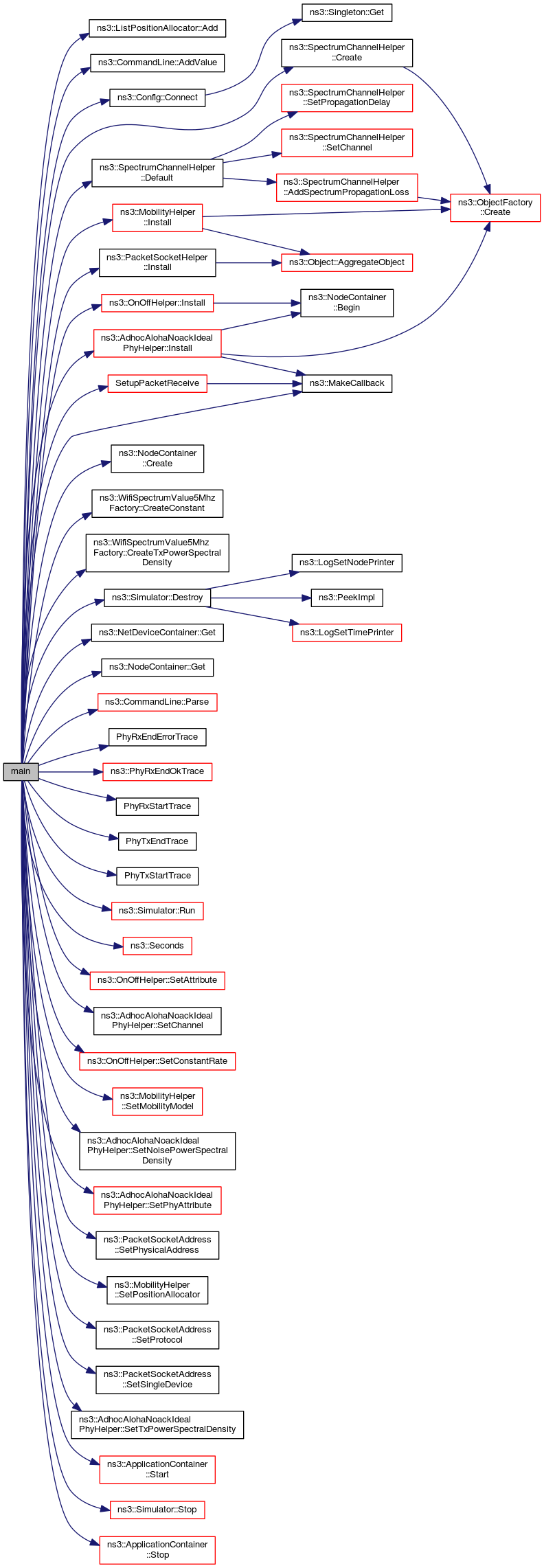 References ns3::ListPositionAllocator::Add(), ns3::CommandLine::AddValue(), ns3::Config::Connect(), ns3::SpectrumChannelHelper::Create(), ns3::NodeContainer::Create(), ns3::WifiSpectrumValue5MhzFactory::CreateConstant(), ns3::WifiSpectrumValue5MhzFactory::CreateTxPowerSpectralDensity(), ns3::SpectrumChannelHelper::Default(), ns3::Simulator::Destroy(), g_verbose, ns3::NetDeviceContainer::Get(), ns3::NodeContainer::Get(), ns3::PacketSocketHelper::Install(), ns3::OnOffHelper::Install(), ns3::AdhocAlohaNoackIdealPhyHelper::Install(), ns3::MobilityHelper::Install(), ns3::MakeCallback(), ns3::CommandLine::Parse(), PhyRxEndErrorTrace(), ns3::PhyRxEndOkTrace(), PhyRxStartTrace(), PhyTxEndTrace(), PhyTxStartTrace(), ns3::Simulator::Run(), ns3::Seconds(), ns3::OnOffHelper::SetAttribute(), ns3::AdhocAlohaNoackIdealPhyHelper::SetChannel(), ns3::OnOffHelper::SetConstantRate(), ns3::MobilityHelper::SetMobilityModel(), ns3::AdhocAlohaNoackIdealPhyHelper::SetNoisePowerSpectralDensity(), ns3::AdhocAlohaNoackIdealPhyHelper::SetPhyAttribute(), ns3::PacketSocketAddress::SetPhysicalAddress(), ns3::MobilityHelper::SetPositionAllocator(), ns3::PacketSocketAddress::SetProtocol(), ns3::PacketSocketAddress::SetSingleDevice(), ns3::AdhocAlohaNoackIdealPhyHelper::SetTxPowerSpectralDensity(), SetupPacketReceive(), ns3::ApplicationContainer::Start(), ns3::Simulator::Stop(), and ns3::ApplicationContainer::Stop().