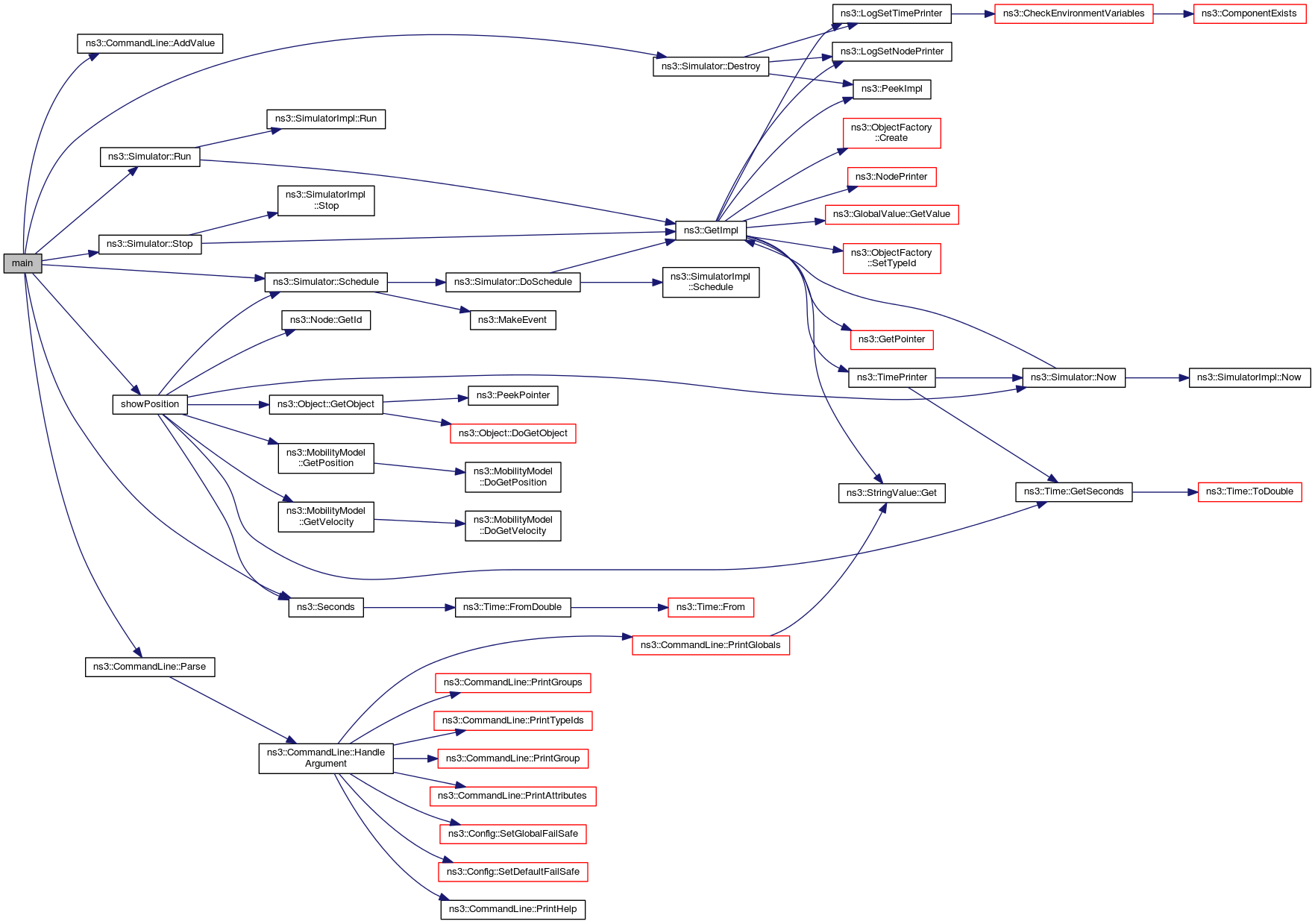 References ns3::CommandLine::AddValue(), ns3::Simulator::Destroy(), ns3::CommandLine::Parse(), ns3::Simulator::Run(), ns3::Simulator::Schedule(), ns3::Seconds(), showPosition(), and ns3::Simulator::Stop().