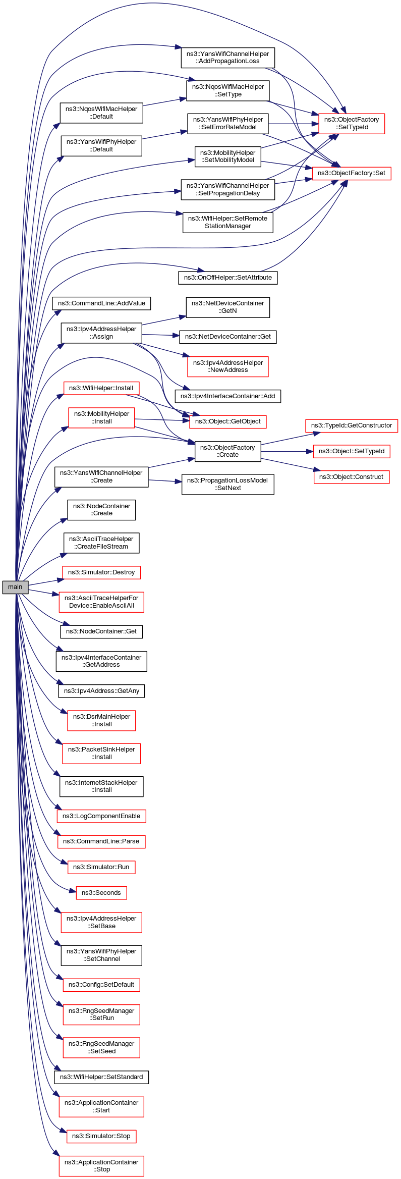 References ns3::YansWifiChannelHelper::AddPropagationLoss(), ns3::CommandLine::AddValue(), ns3::Ipv4AddressHelper::Assign(), ns3::ObjectFactory::Create(), ns3::YansWifiChannelHelper::Create(), ns3::NodeContainer::Create(), ns3::AsciiTraceHelper::CreateFileStream(), ns3::NqosWifiMacHelper::Default(), ns3::YansWifiPhyHelper::Default(), ns3::Simulator::Destroy(), ns3::AsciiTraceHelperForDevice::EnableAsciiAll(), ns3::NodeContainer::Get(), ns3::Ipv4InterfaceContainer::GetAddress(), ns3::Ipv4Address::GetAny(), ns3::Object::GetObject(), ns3::DsrMainHelper::Install(), ns3::PacketSinkHelper::Install(), ns3::InternetStackHelper::Install(), ns3::WifiHelper::Install(), ns3::MobilityHelper::Install(), ns3::LOG_LEVEL_ALL, ns3::LogComponentEnable(), NS_LOG_INFO, ns3::CommandLine::Parse(), port, ns3::Simulator::Run(), ns3::Seconds(), ns3::ObjectFactory::Set(), ns3::OnOffHelper::SetAttribute(), ns3::Ipv4AddressHelper::SetBase(), ns3::YansWifiPhyHelper::SetChannel(), ns3::Config::SetDefault(), ns3::MobilityHelper::SetMobilityModel(), ns3::YansWifiChannelHelper::SetPropagationDelay(), ns3::WifiHelper::SetRemoteStationManager(), ns3::RngSeedManager::SetRun(), ns3::RngSeedManager::SetSeed(), ns3::WifiHelper::SetStandard(), ns3::NqosWifiMacHelper::SetType(), ns3::ObjectFactory::SetTypeId(), ns3::ApplicationContainer::Start(), ns3::Simulator::Stop(), ns3::ApplicationContainer::Stop(), and ns3::WIFI_PHY_STANDARD_80211b.