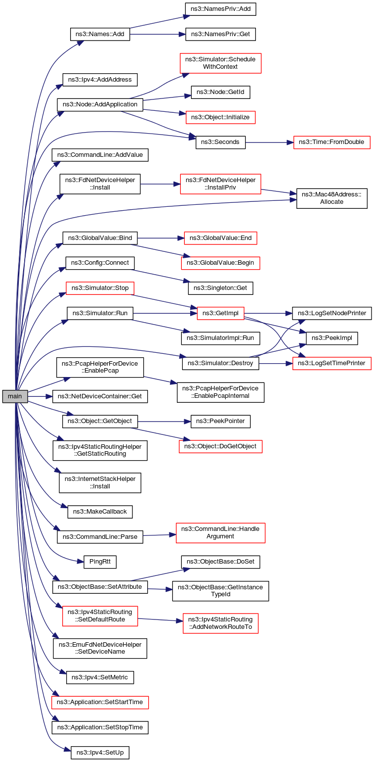 References ns3::Names::Add(), ns3::Ipv4::AddAddress(), ns3::Node::AddApplication(), ns3::CommandLine::AddValue(), ns3::Mac48Address::Allocate(), ns3::GlobalValue::Bind(), ns3::Config::Connect(), ns3::Simulator::Destroy(), ns3::PcapHelperForDevice::EnablePcap(), ns3::NetDeviceContainer::Get(), ns3::Object::GetObject(), ns3::Ipv4StaticRoutingHelper::GetStaticRouting(), ns3::FdNetDeviceHelper::Install(), ns3::InternetStackHelper::Install(), ns3::MakeCallback(), NS_ABORT_MSG_IF, NS_LOG_INFO, ns3::CommandLine::Parse(), PingRtt(), ns3::Simulator::Run(), ns3::Seconds(), ns3::ObjectBase::SetAttribute(), ns3::Ipv4StaticRouting::SetDefaultRoute(), ns3::EmuFdNetDeviceHelper::SetDeviceName(), ns3::Ipv4::SetMetric(), ns3::Application::SetStartTime(), ns3::Application::SetStopTime(), ns3::Ipv4::SetUp(), and ns3::Simulator::Stop().