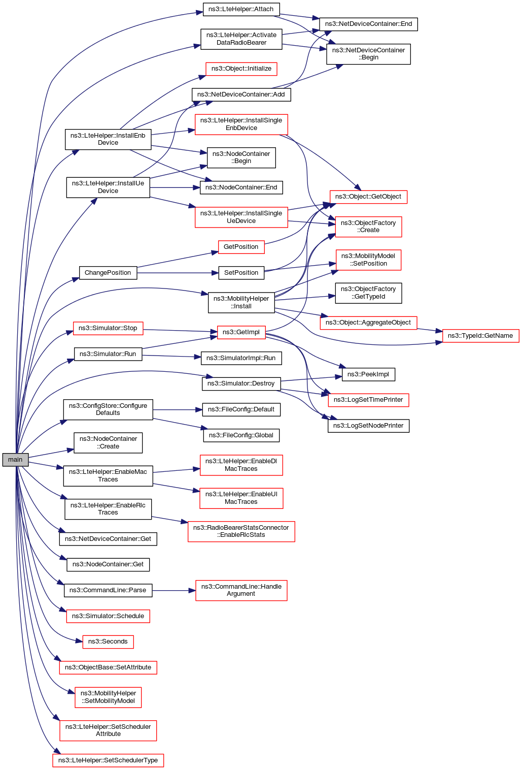 References ns3::LteHelper::ActivateDataRadioBearer(), ns3::LteHelper::Attach(), ChangePosition(), ns3::ConfigStore::ConfigureDefaults(), ns3::NodeContainer::Create(), ns3::Simulator::Destroy(), ns3::LteHelper::EnableMacTraces(), ns3::LteHelper::EnableRlcTraces(), ns3::EpsBearer::GBR_CONV_VOICE, ns3::NetDeviceContainer::Get(), ns3::NodeContainer::Get(), ns3::MobilityHelper::Install(), ns3::LteHelper::InstallEnbDevice(), ns3::LteHelper::InstallUeDevice(), ns3::CommandLine::Parse(), ns3::Simulator::Run(), ns3::Simulator::Schedule(), ns3::Seconds(), ns3::ObjectBase::SetAttribute(), ns3::MobilityHelper::SetMobilityModel(), ns3::LteHelper::SetSchedulerAttribute(), ns3::LteHelper::SetSchedulerType(), and ns3::Simulator::Stop().