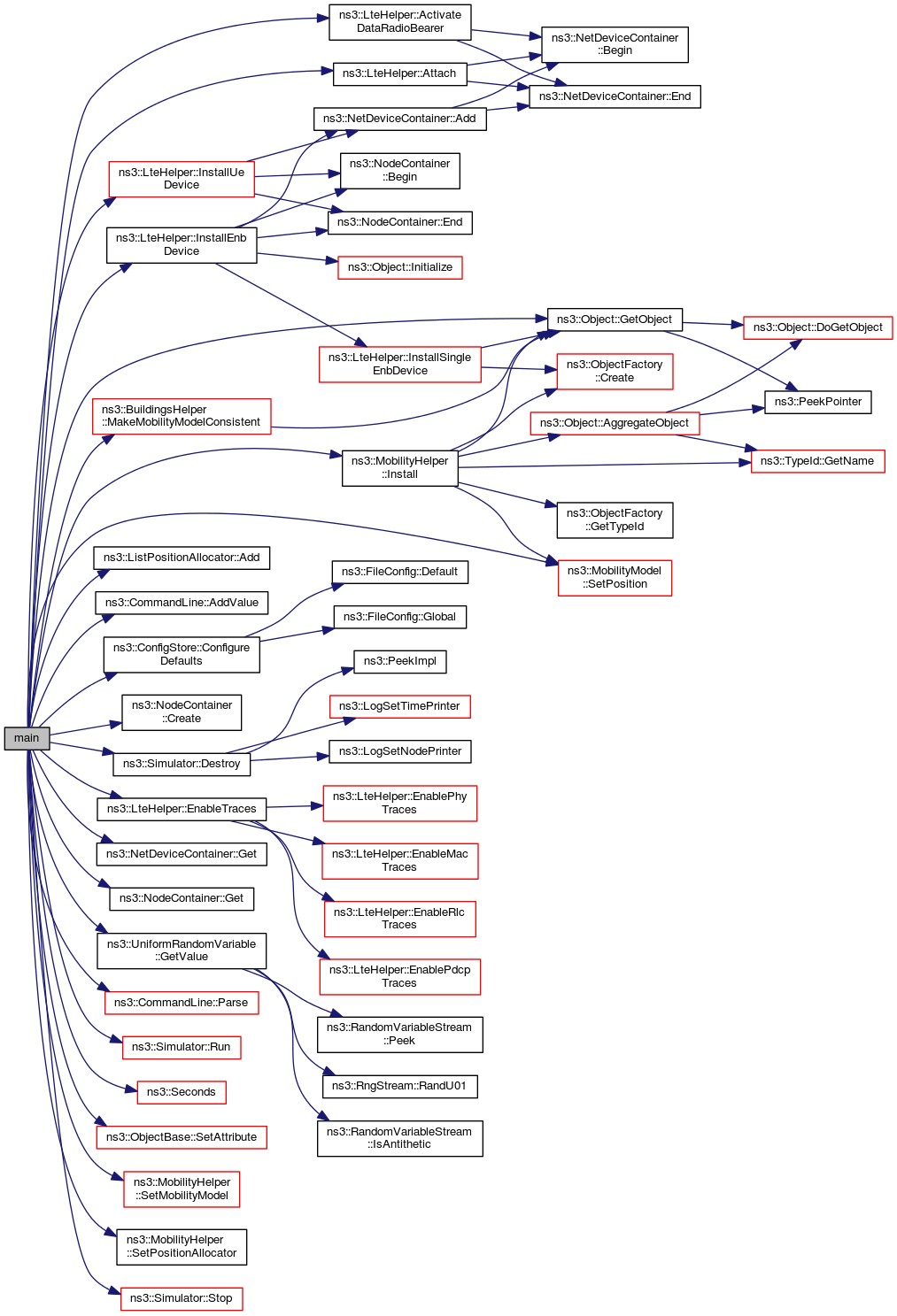 References ns3::LteHelper::ActivateDataRadioBearer(), ns3::ListPositionAllocator::Add(), ns3::CommandLine::AddValue(), ns3::LteHelper::Attach(), ns3::Building::ConcreteWithWindows, ns3::ConfigStore::ConfigureDefaults(), ns3::NodeContainer::Create(), ns3::Simulator::Destroy(), ns3::LteHelper::EnableTraces(), ns3::EpsBearer::GBR_CONV_VOICE, ns3::NetDeviceContainer::Get(), ns3::NodeContainer::Get(), ns3::Object::GetObject(), ns3::UniformRandomVariable::GetValue(), ns3::MobilityHelper::Install(), ns3::LteHelper::InstallEnbDevice(), ns3::LteHelper::InstallUeDevice(), ns3::BuildingsHelper::MakeMobilityModelConsistent(), ns3::CommandLine::Parse(), ns3::Building::Residential, ns3::Simulator::Run(), ns3::Seconds(), ns3::ObjectBase::SetAttribute(), ns3::MobilityHelper::SetMobilityModel(), ns3::MobilityModel::SetPosition(), ns3::MobilityHelper::SetPositionAllocator(), ns3::Simulator::Stop(), ns3::Vector3D::x, ns3::Vector3D::y, and ns3::Vector3D::z.