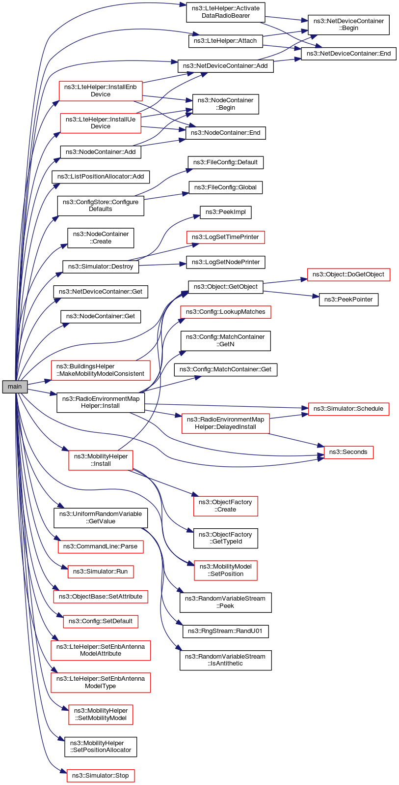 References ns3::LteHelper::ActivateDataRadioBearer(), ns3::ListPositionAllocator::Add(), ns3::NetDeviceContainer::Add(), ns3::NodeContainer::Add(), ns3::LteHelper::Attach(), ns3::Building::ConcreteWithWindows, ns3::ConfigStore::ConfigureDefaults(), ns3::NodeContainer::Create(), ns3::Simulator::Destroy(), ns3::EpsBearer::GBR_CONV_VOICE, ns3::NetDeviceContainer::Get(), ns3::NodeContainer::Get(), ns3::Object::GetObject(), ns3::UniformRandomVariable::GetValue(), ns3::RadioEnvironmentMapHelper::Install(), ns3::MobilityHelper::Install(), ns3::LteHelper::InstallEnbDevice(), ns3::LteHelper::InstallUeDevice(), ns3::BuildingsHelper::MakeMobilityModelConsistent(), ns3::CommandLine::Parse(), ns3::Building::Residential, ns3::Simulator::Run(), ns3::Seconds(), ns3::ObjectBase::SetAttribute(), ns3::Config::SetDefault(), ns3::LteHelper::SetEnbAntennaModelAttribute(), ns3::LteHelper::SetEnbAntennaModelType(), ns3::MobilityHelper::SetMobilityModel(), ns3::MobilityModel::SetPosition(), ns3::MobilityHelper::SetPositionAllocator(), and ns3::Simulator::Stop().