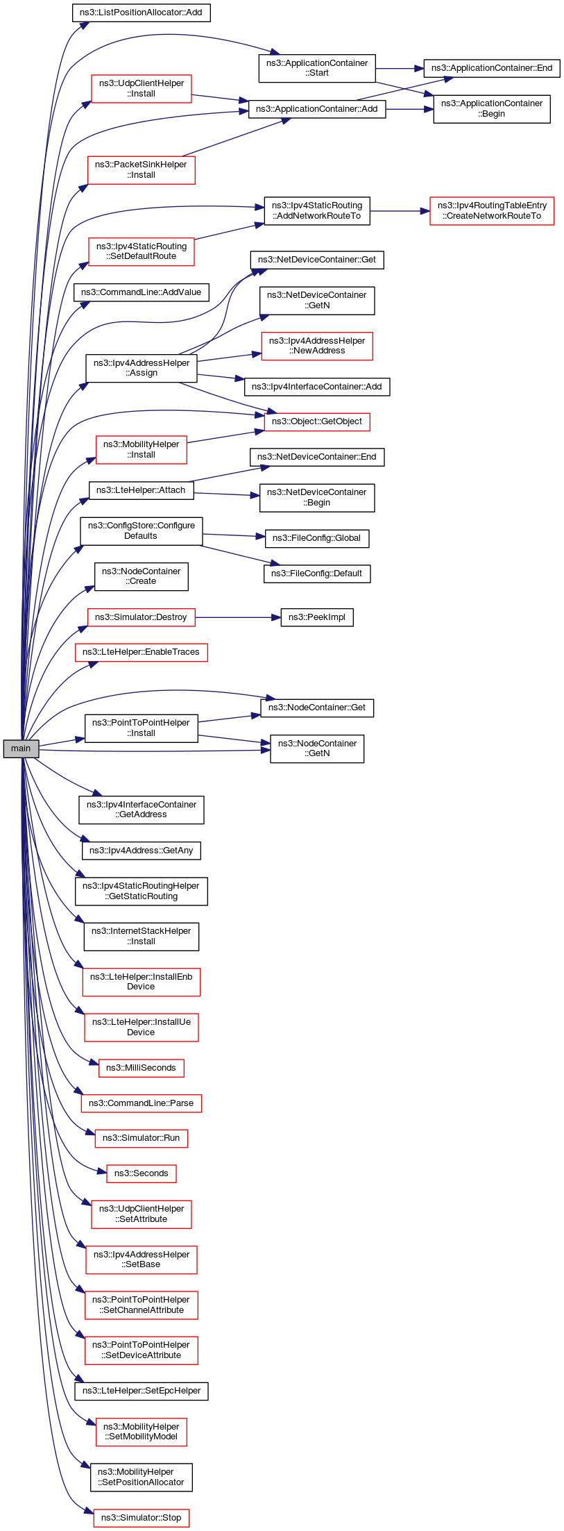 References ns3::ListPositionAllocator::Add(), ns3::ApplicationContainer::Add(), ns3::Ipv4StaticRouting::AddNetworkRouteTo(), ns3::CommandLine::AddValue(), ns3::Ipv4AddressHelper::Assign(), ns3::LteHelper::Attach(), ns3::ConfigStore::ConfigureDefaults(), ns3::NodeContainer::Create(), ns3::Simulator::Destroy(), ns3::LteHelper::EnableTraces(), ns3::NetDeviceContainer::Get(), ns3::NodeContainer::Get(), ns3::Ipv4InterfaceContainer::GetAddress(), ns3::Ipv4Address::GetAny(), ns3::NodeContainer::GetN(), ns3::Object::GetObject(), ns3::Ipv4StaticRoutingHelper::GetStaticRouting(), ns3::PacketSinkHelper::Install(), ns3::PointToPointHelper::Install(), ns3::InternetStackHelper::Install(), ns3::UdpClientHelper::Install(), ns3::MobilityHelper::Install(), ns3::LteHelper::InstallEnbDevice(), ns3::LteHelper::InstallUeDevice(), ns3::MilliSeconds(), ns3::CommandLine::Parse(), ns3::Simulator::Run(), ns3::Seconds(), ns3::UdpClientHelper::SetAttribute(), ns3::Ipv4AddressHelper::SetBase(), ns3::PointToPointHelper::SetChannelAttribute(), ns3::Ipv4StaticRouting::SetDefaultRoute(), ns3::PointToPointHelper::SetDeviceAttribute(), ns3::LteHelper::SetEpcHelper(), ns3::MobilityHelper::SetMobilityModel(), ns3::MobilityHelper::SetPositionAllocator(), ns3::ApplicationContainer::Start(), and ns3::Simulator::Stop().