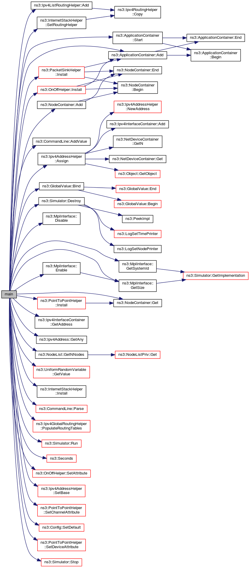 References ns3::Ipv4ListRoutingHelper::Add(), ns3::ApplicationContainer::Add(), ns3::NodeContainer::Add(), ns3::CommandLine::AddValue(), ns3::Ipv4AddressHelper::Assign(), ns3::GlobalValue::Bind(), ns3::Simulator::Destroy(), ns3::MpiInterface::Disable(), ns3::MpiInterface::Enable(), ns3::NodeContainer::Get(), ns3::Ipv4InterfaceContainer::GetAddress(), ns3::Ipv4Address::GetAny(), ns3::NodeList::GetNNodes(), ns3::MpiInterface::GetSize(), ns3::MpiInterface::GetSystemId(), ns3::UniformRandomVariable::GetValue(), ns3::PacketSinkHelper::Install(), ns3::OnOffHelper::Install(), ns3::PointToPointHelper::Install(), ns3::InternetStackHelper::Install(), list, NS_FATAL_ERROR, ns3::CommandLine::Parse(), ns3::Ipv4GlobalRoutingHelper::PopulateRoutingTables(), ns3::Simulator::Run(), ns3::Seconds(), ns3::OnOffHelper::SetAttribute(), ns3::Ipv4AddressHelper::SetBase(), ns3::PointToPointHelper::SetChannelAttribute(), ns3::Config::SetDefault(), ns3::PointToPointHelper::SetDeviceAttribute(), ns3::InternetStackHelper::SetRoutingHelper(), ns3::ApplicationContainer::Start(), ns3::Simulator::Stop(), TIMER_DIFF, TIMER_NOW, and sample-rng-plot::x.