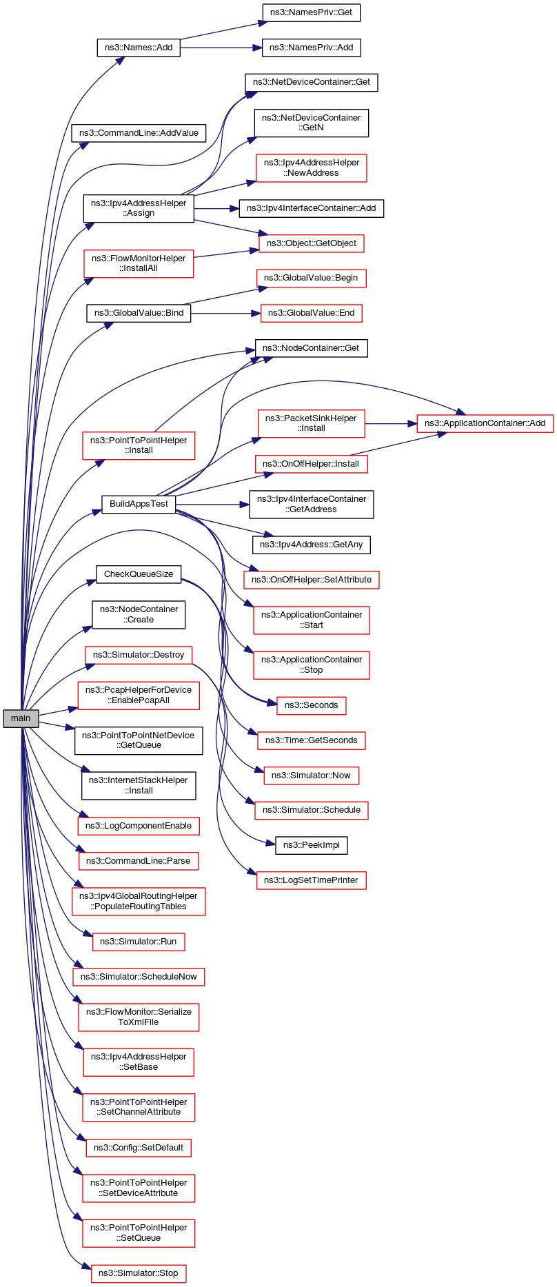 References ns3::Names::Add(), ns3::CommandLine::AddValue(), ns3::Ipv4AddressHelper::Assign(), ns3::GlobalValue::Bind(), BuildAppsTest(), CheckQueueSize(), client_start_time, client_stop_time, ns3::NodeContainer::Create(), ns3::Simulator::Destroy(), ns3::PcapHelperForDevice::EnablePcapAll(), filePlotQueue, filePlotQueueAvg, ns3::NetDeviceContainer::Get(), ns3::NodeContainer::Get(), ns3::PointToPointNetDevice::GetQueue(), global_start_time, global_stop_time, i0i2, i1i2, i2i3, i3i4, i3i5, ns3::PointToPointHelper::Install(), ns3::InternetStackHelper::Install(), ns3::FlowMonitorHelper::InstallAll(), ns3::LOG_LEVEL_INFO, ns3::LogComponentEnable(), n0n2, n1n2, n2n3, n3n4, n3n5, NS_ABORT_MSG, NS_LOG_INFO, ns3::CommandLine::Parse(), ns3::Ipv4GlobalRoutingHelper::PopulateRoutingTables(), ns3::Queue::QUEUE_MODE_PACKETS, ns3::Simulator::Run(), ns3::Simulator::ScheduleNow(), ns3::Seconds(), ns3::FlowMonitor::SerializeToXmlFile(), ns3::Ipv4AddressHelper::SetBase(), ns3::PointToPointHelper::SetChannelAttribute(), ns3::Config::SetDefault(), ns3::PointToPointHelper::SetDeviceAttribute(), ns3::PointToPointHelper::SetQueue(), sink_start_time, sink_stop_time, and ns3::Simulator::Stop().