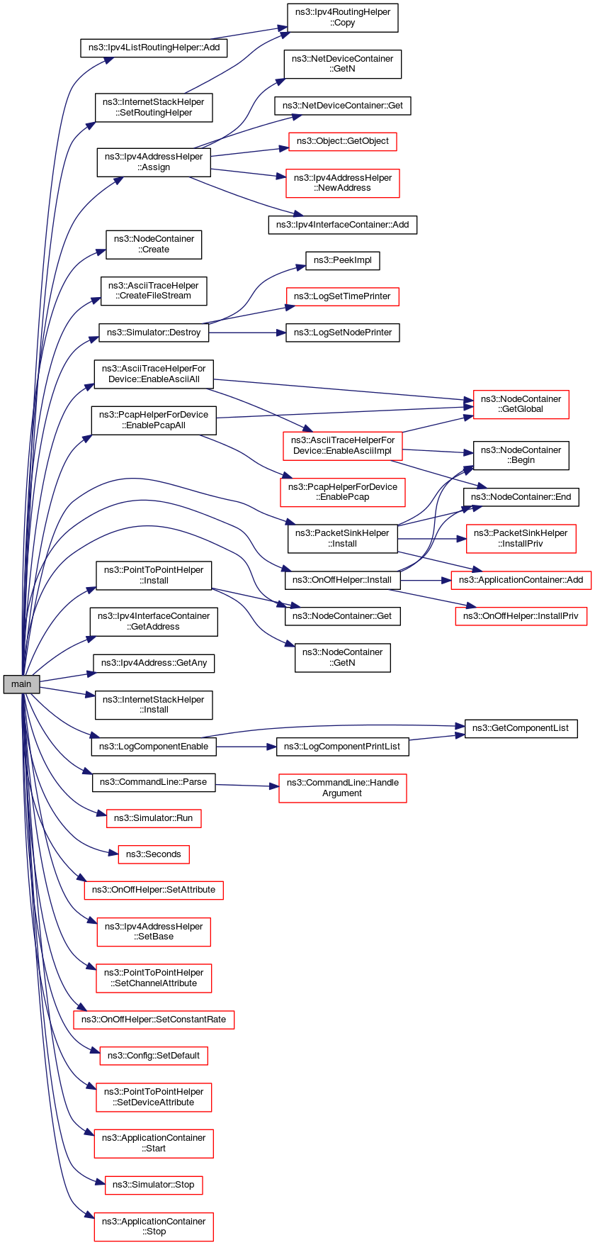 References ns3::Ipv4ListRoutingHelper::Add(), ns3::Ipv4AddressHelper::Assign(), ns3::NodeContainer::Create(), ns3::AsciiTraceHelper::CreateFileStream(), ns3::Simulator::Destroy(), ns3::AsciiTraceHelperForDevice::EnableAsciiAll(), ns3::PcapHelperForDevice::EnablePcapAll(), ns3::NodeContainer::Get(), ns3::Ipv4InterfaceContainer::GetAddress(), ns3::Ipv4Address::GetAny(), ns3::PacketSinkHelper::Install(), ns3::OnOffHelper::Install(), ns3::PointToPointHelper::Install(), ns3::InternetStackHelper::Install(), list, ns3::LOG_LEVEL_INFO, ns3::LogComponentEnable(), NS_LOG_INFO, ns3::CommandLine::Parse(), port, ns3::Simulator::Run(), ns3::Seconds(), ns3::OnOffHelper::SetAttribute(), ns3::Ipv4AddressHelper::SetBase(), ns3::PointToPointHelper::SetChannelAttribute(), ns3::OnOffHelper::SetConstantRate(), ns3::Config::SetDefault(), ns3::PointToPointHelper::SetDeviceAttribute(), ns3::InternetStackHelper::SetRoutingHelper(), ns3::ApplicationContainer::Start(), ns3::Simulator::Stop(), and ns3::ApplicationContainer::Stop().